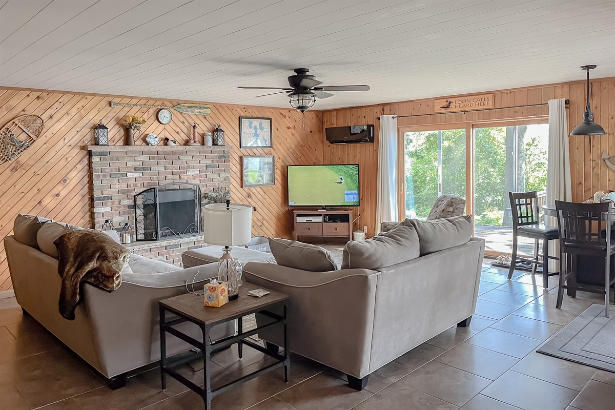 Gather in the rustic and refined living area, featuring a <b>large brick fireplace</b>, <b>tongue-and-groove wood walls</b>, an <b>oversized sectional sofa</b>, and a <b>large smart TV</b> for movie nights or game-day viewing.