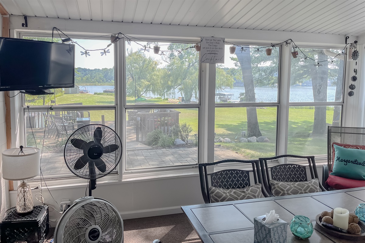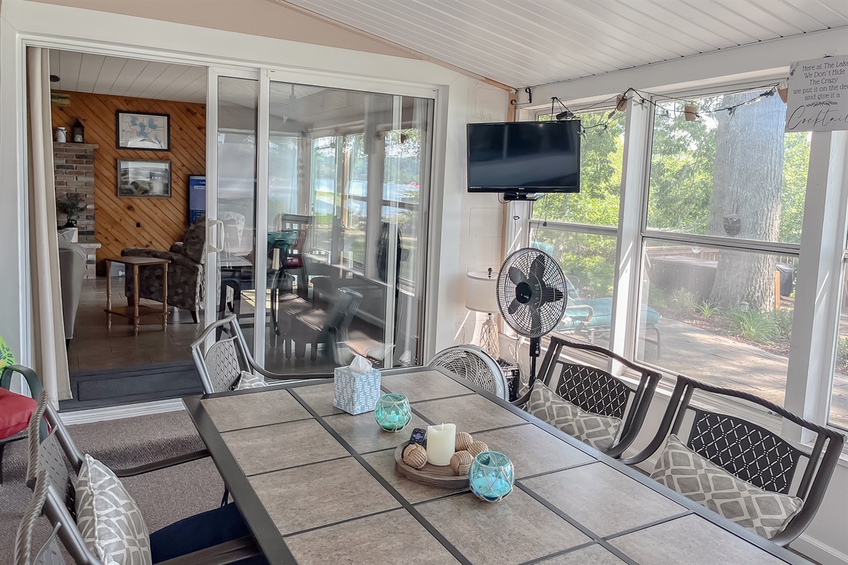 The home offers both indoor and enclosed options — a <b>large high-top dining table</b> with seating for four, plus a <b>heated sunroom</b> with an additional <b>dining table for six</b>.