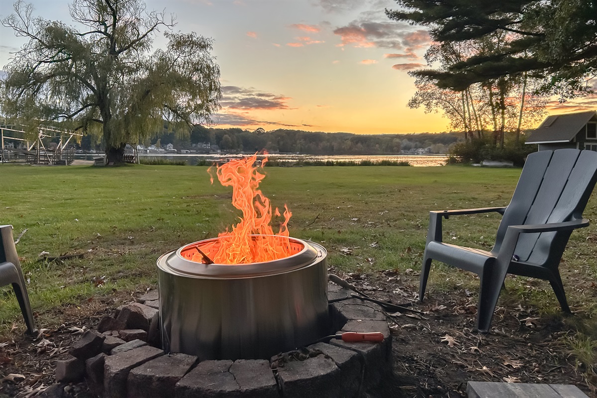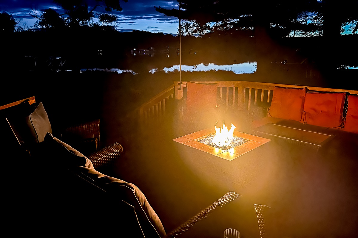 Head down to the <b>lower deck</b> for more intimate nights around a <b>wood-burning firepit</b>, surrounded by nature and the sounds of the lake.