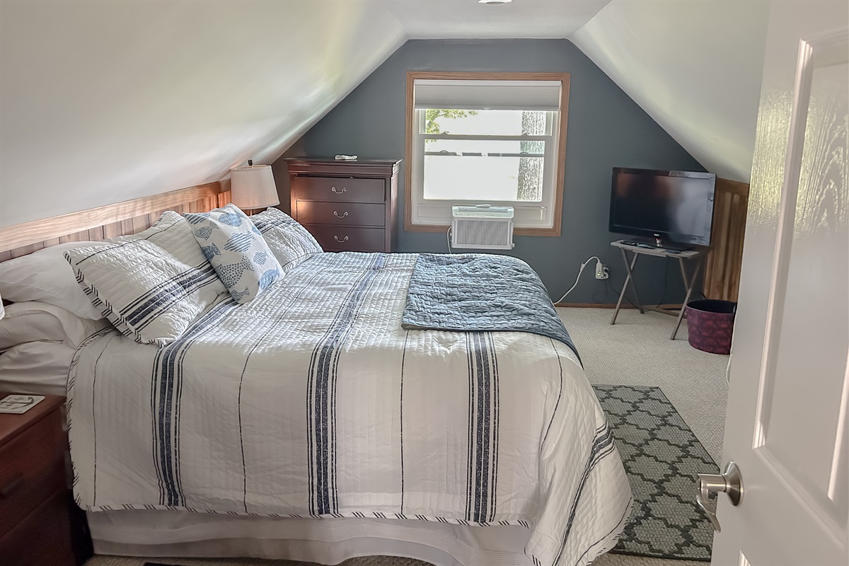 Located upstairs, the spacious primary room features a <b>king-size bed</b>, plush bedding, and elevated views of the trees and lake beyond.